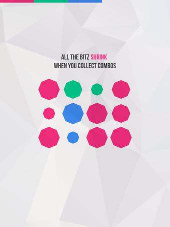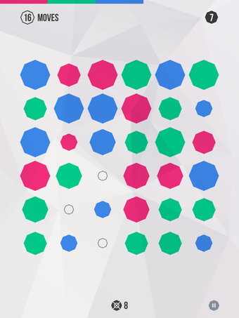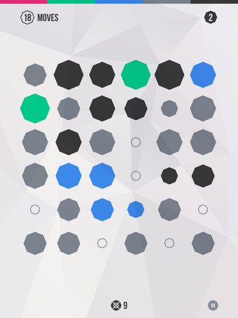 グレー、ピンク、ブラック、グリーン、ブルーの5色のさまざまな大きさのブロックがあります。同じ色のブロックを縦横斜めで連続してなぞっていきます。20回のムーブでできるだけ多くのブロックを消してスコアを稼ぎます。
